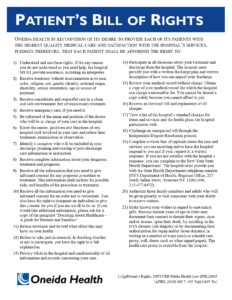 ONEIDA HEALTH IN RECOGNITION OF ITS DESIRE TO PROVIDE EACH OF ITS PATIENTS WITH THE HIGHEST QUALITY MEDICAL CARE AND SATISFACTION WITH THE HOSPITAL’S SERVICES, PLEDGES THEREFORE, THAT EACH PATIENT SHALL BE AFFORDED THE RIGHT TO: